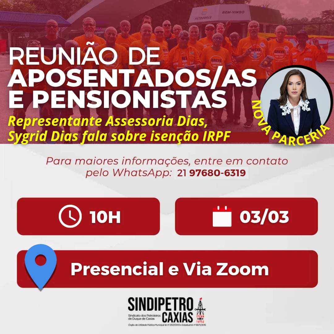 A convite do Sindipetro Caxias, a representante da Assessoria Dias, Sygrid Dias conversará com os/as presentes sobre a nova parceria com o Sindicato para Isenção de Imposto de Renda Pessoal Física e a recuperação dos valores pagos indevidamente nos últimos cinco anos através de ação administrativa.