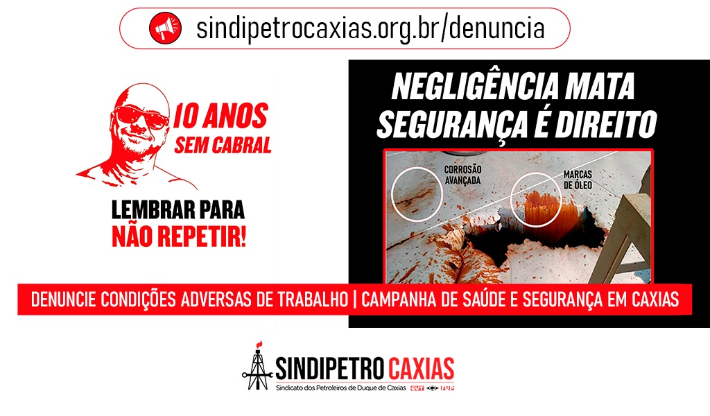 Lembrar para não repetir! Há 10 anos perdemos o companheiro Cabral pelo deliberado descaso da gestão da Petrobrás à saúde e segurança dos trabalhadores e trabalhadoras. Hoje, 02/02/2016, o Sindipetro Caxias homenageia a memória deste companheiro, Técnico de Operação da TE/ML da REDUC que nos deixou em um acidente que, de tão absurdo, absurdo de tornou um marco do descaso com a vida, dita um compromisso da empresa, causado por uma lista interminável de imperícias e negligências da empresa. Algo que não pode jamais ser admitido de novo. Assim, estamos lançando a Campanha de Saúde e Segurança de Trabalhadores e Trabalhadoras (SST) da categoria petroleira de Caxias. Convocamos nossas bases a relembrarem a memória de Cabral e fortalecerem as nossas lutas em SST. Pela recomposição do efetivo e a adequação das instalações. Por reconhecimento dos perigos do nosso trabalho e garantia de saúde e segurança operacional para todos e todas. Contamos com você para construirmos firmes a nossa luta por melhores condições de trabalho, sem mortes e sem adoecimento.