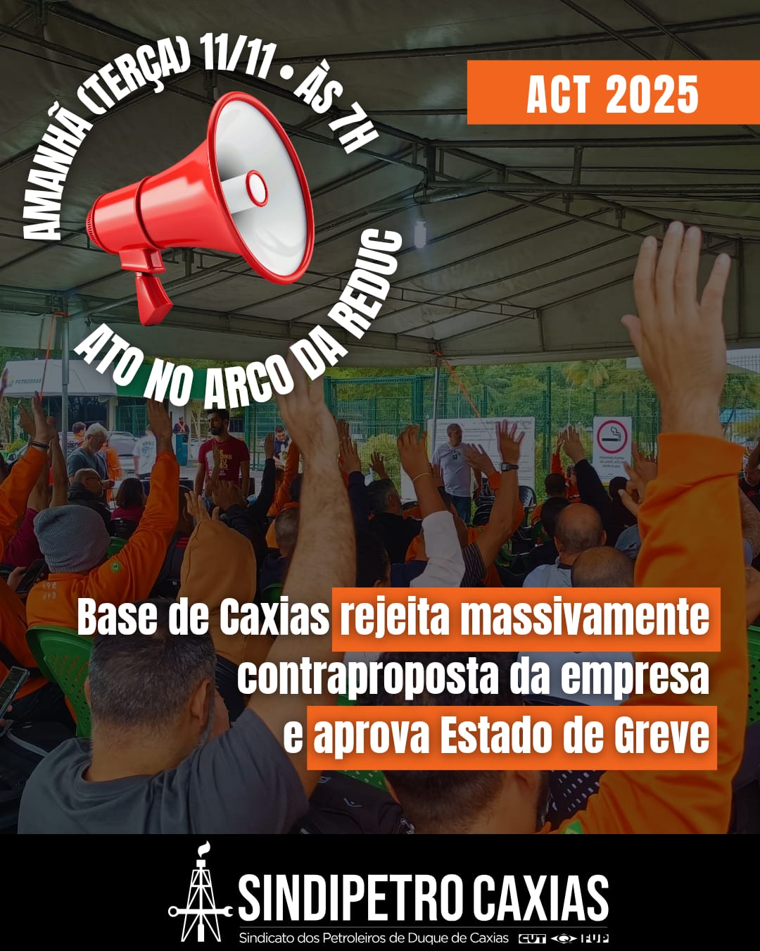 Amanhã 11/11! Convocamos a categoria petroleira para o Ato amanhã (11/11 – terça), às 7h, no Arco da REDUC. Por um ACT com ganhos reais e direitos, pela retomada dos ativos privatizados e pela reconstrução da Petrobrás!