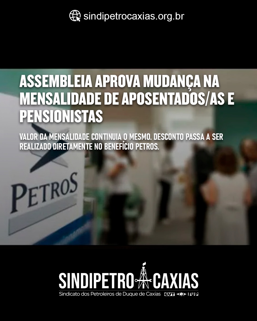Em assembleia do Sindipetro Caxias, realizada nessa terça-feira, 3 de fevereiro, foi aprovada por unanimidade a adequação da forma de desconto da mensalidade associativa de aposentados/as e pensionistas, em razão das alterações na legislação federal que proibiram o desconto de entidades associativas diretamente nos benefícios pagos pelo INSS.