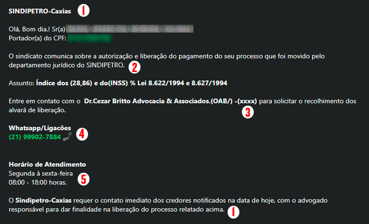 Nesta segunda-feira, 6, associados do Sindipetro Caxias receberam mensagem via whastapp de um número que NÃO PERTENCE AO JURÍDICO DO SINDICATO.
